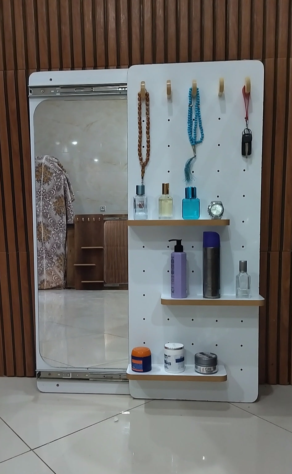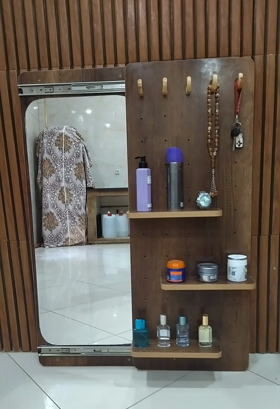 مراية حائط منزلقة انيقة بطول كامل مع خطافات للتخزين و رفوف
